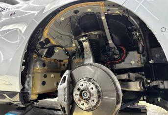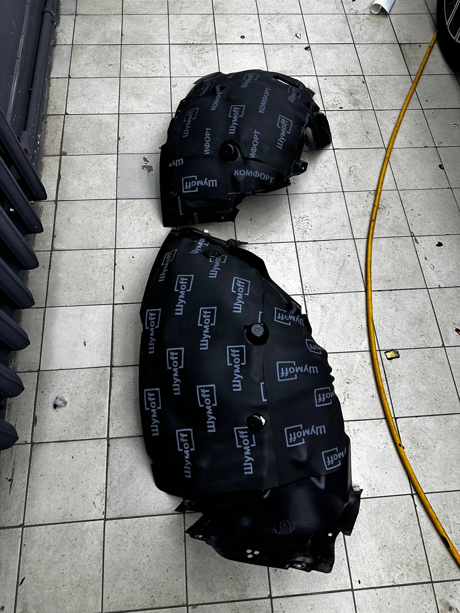 Передние подкрылки пластиковые, на них мы монтируем локально виброизоляцию Шумофф Jack и шумоизолятор Шумофф Комфорт 6. После монтажа материалов на подкрылок и кузов автомобиля заливаем жидким полимером, тем самым герметизируем швы и защищаем шумоизоляционные материалы от механических повреждений. После полного высыхания полимер обретает высокую прочность.