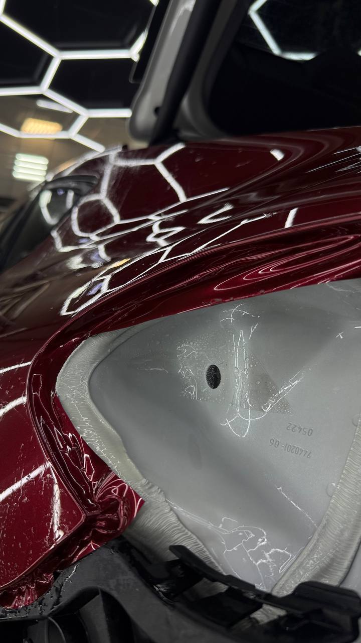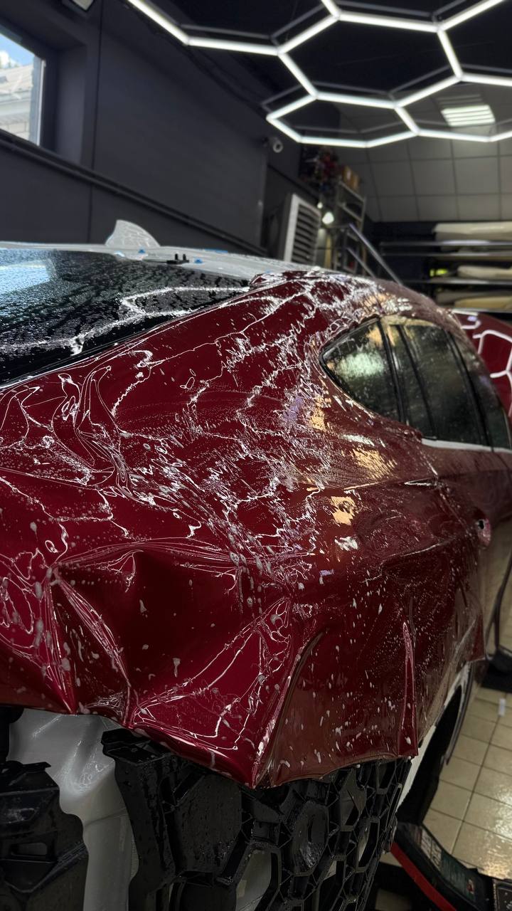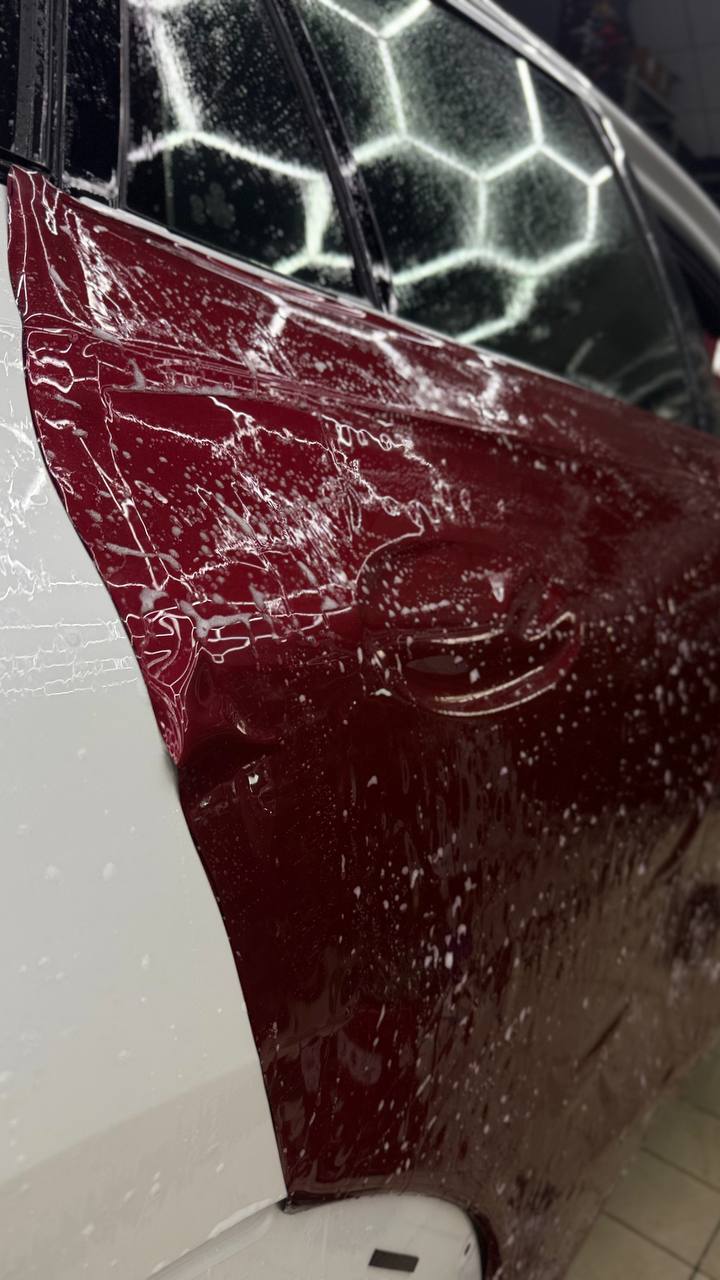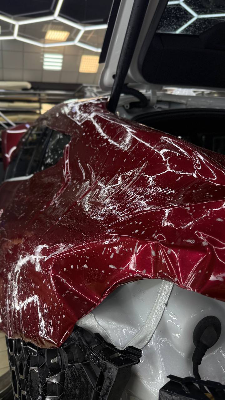 Пленка обладает высоким гидрофобным эффектом и грязь не будет задерживаться на кузове. Ну и самое главное это защита, каждый оклеенный элемент выполнен с подворотом пленки по периметру. Сколы и царапины больше не угрожают оклеенным кузовным элементам данного автомобиля, и если вдруг произойдет неприятная ситуация с мелким ДТП к примеру во дворе, с большей долей вероятности этот вопрос решиться заменой пленки на отдельном элементе. Так же автомобиль обрел на долго гарантированный блеск, так как пленка имеет самозаживляющий эффект и мелкие риски и царапинки будут затягиваться под воздействием температуры.