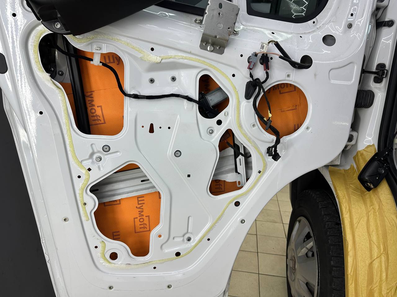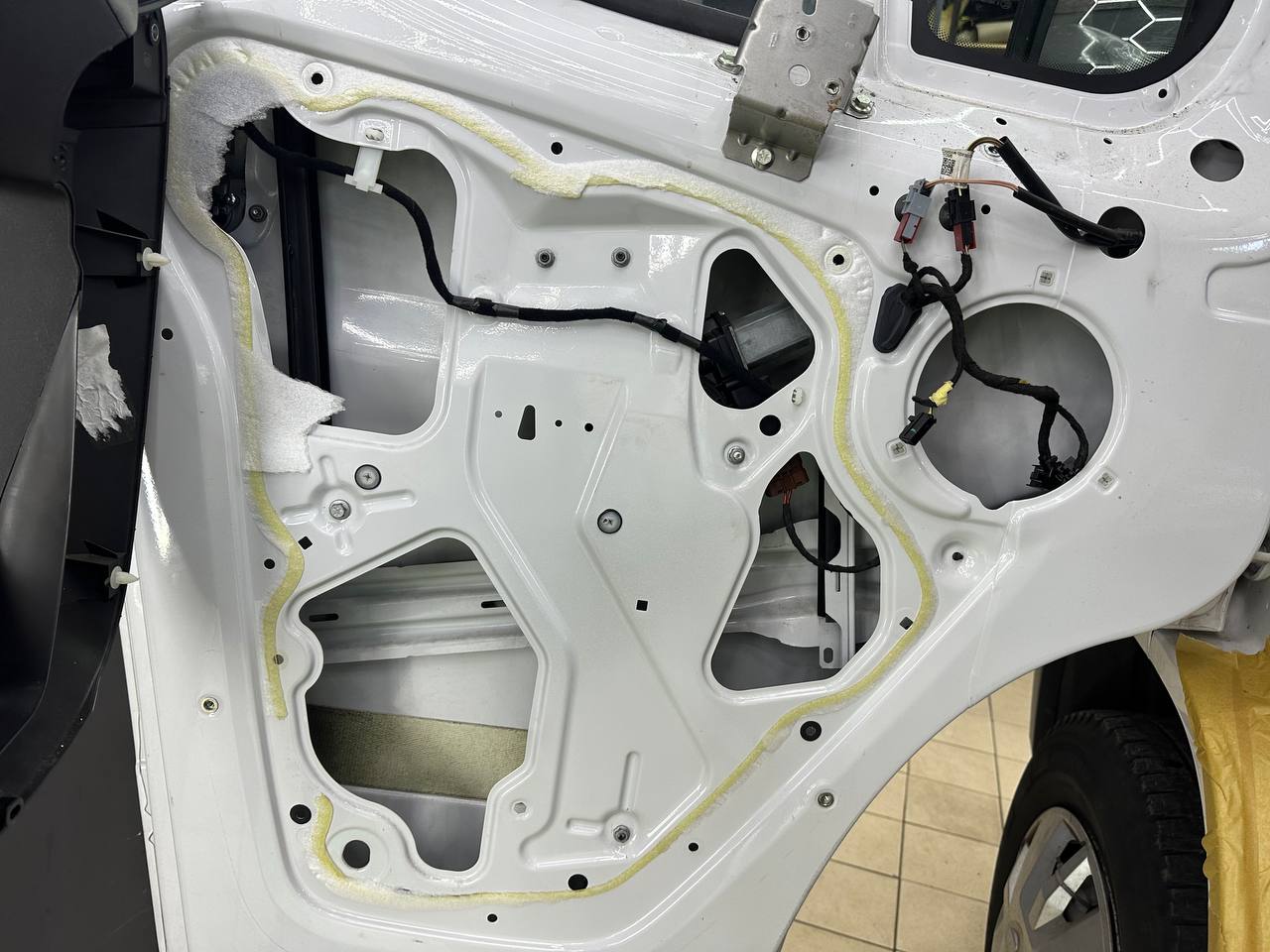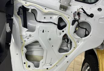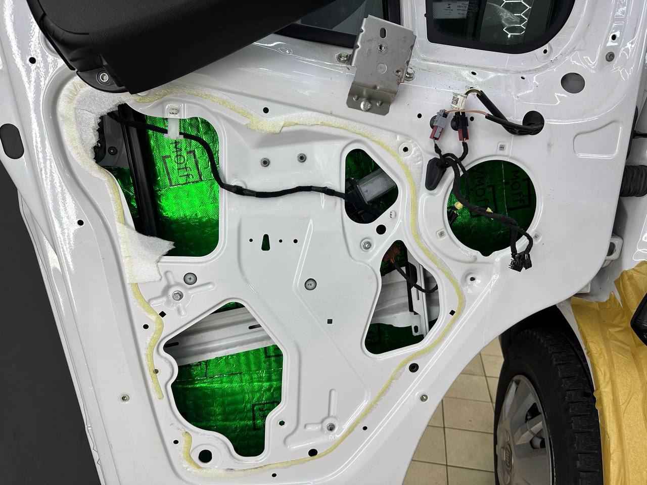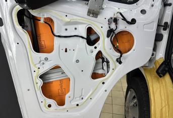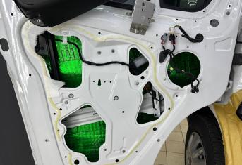 Вторую стенку двери обрабатываем Шумофф М2. Саму обшивку двери локально оклеиваем виброизоляцией Шумофф М2 для снижения резонанса пластика и полностью закрываем новым шумопоглощающим материалом Шумофф Velvet. По канту обшивки двери и клипсы обрабатываем Шумофф Absorber 5, а на открытую проводку Шумофф Specific.