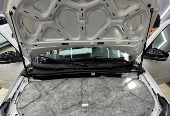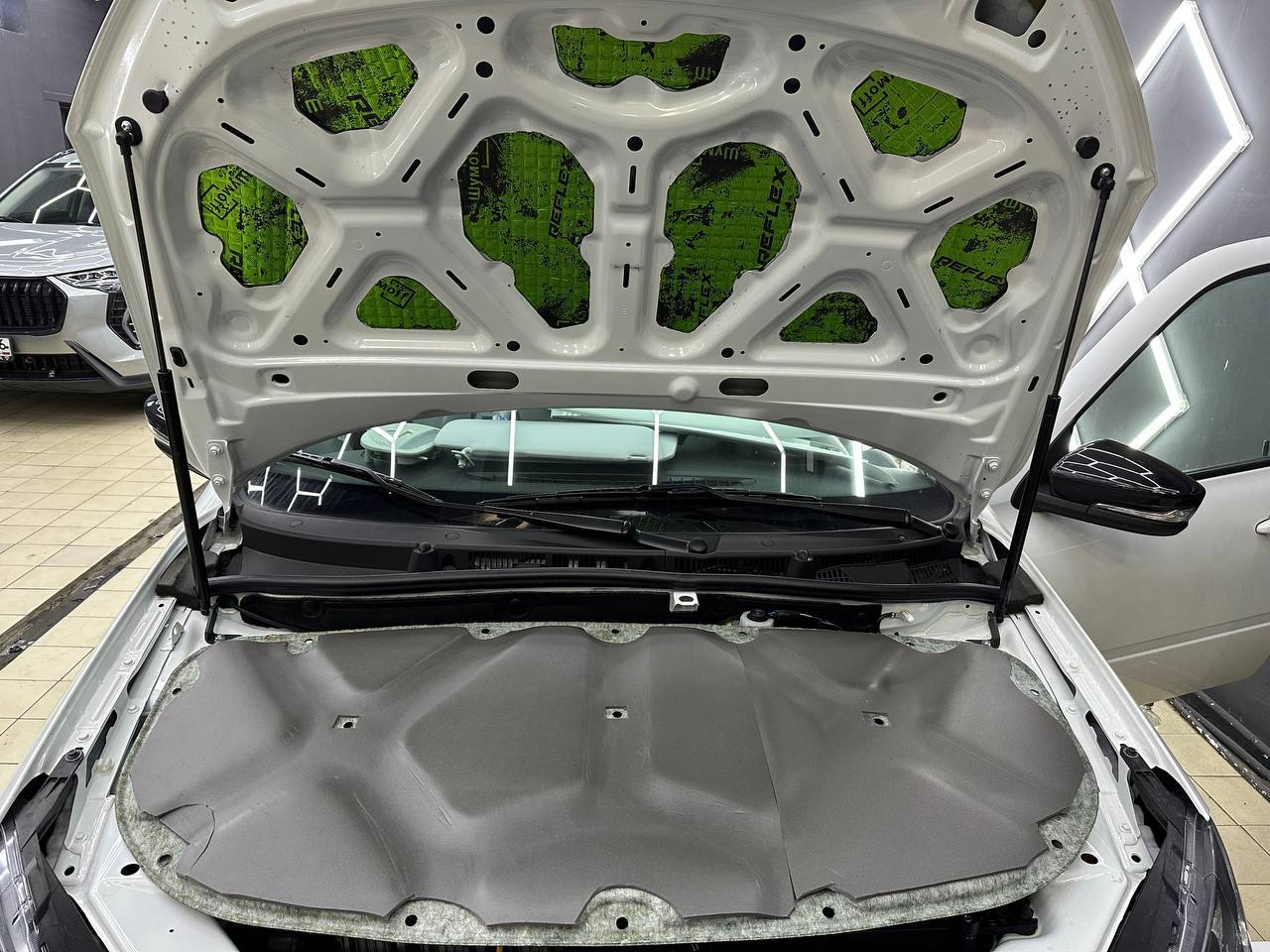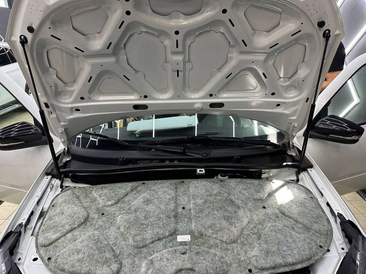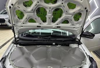 В технологические отверстия капота, на внешний металл, монтируем виброизоляцию Шумофф М2 и на штатную применяем шумо-теплоизоляцию Practik Base 4.