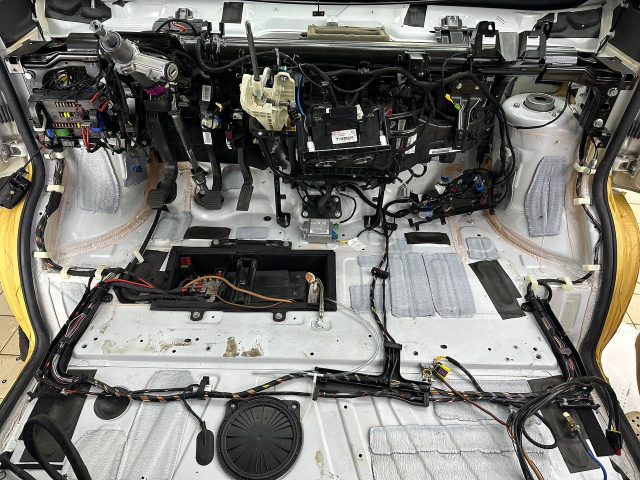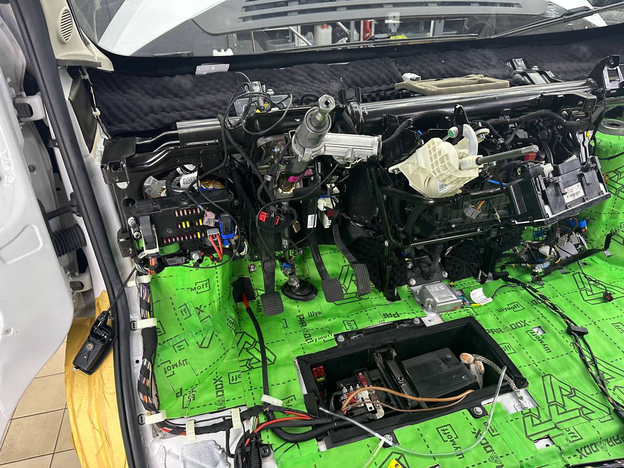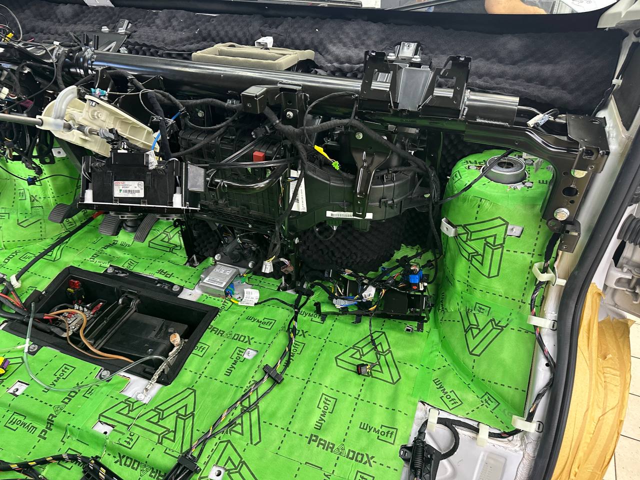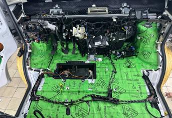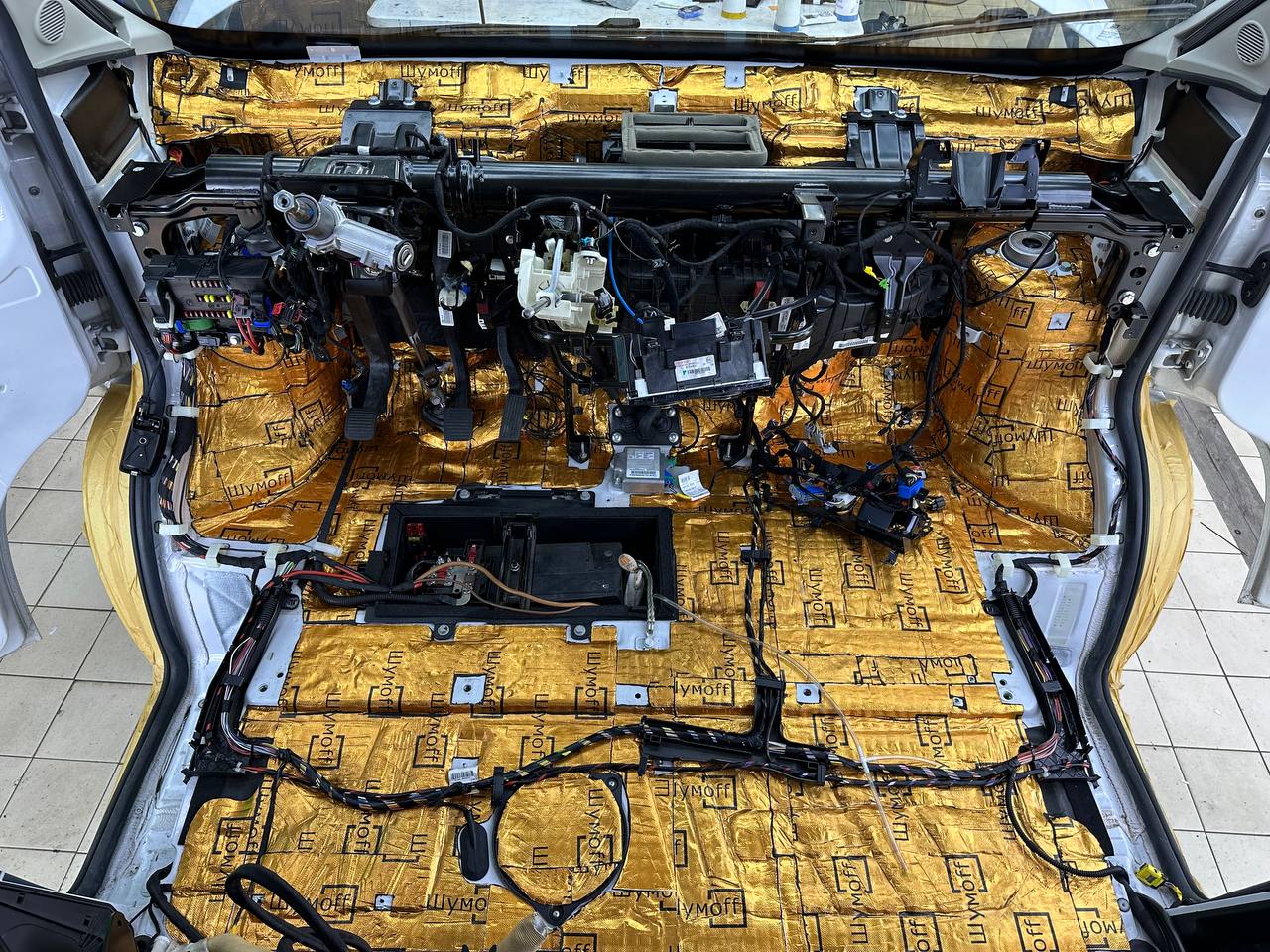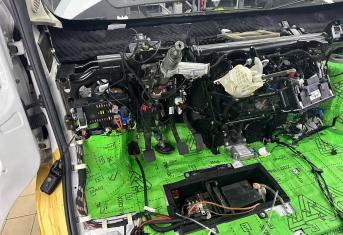 Приступаем к работам с полом и торпедой, на разборку всего салона уходит около 2-3 часов на данном авто включая торпеду. После чего мы подготавливаем поверхность, очистив ее от пыли и предварительно обезжирив. Штатная виброизоляция хорошо держится и её мы не демонтировали.