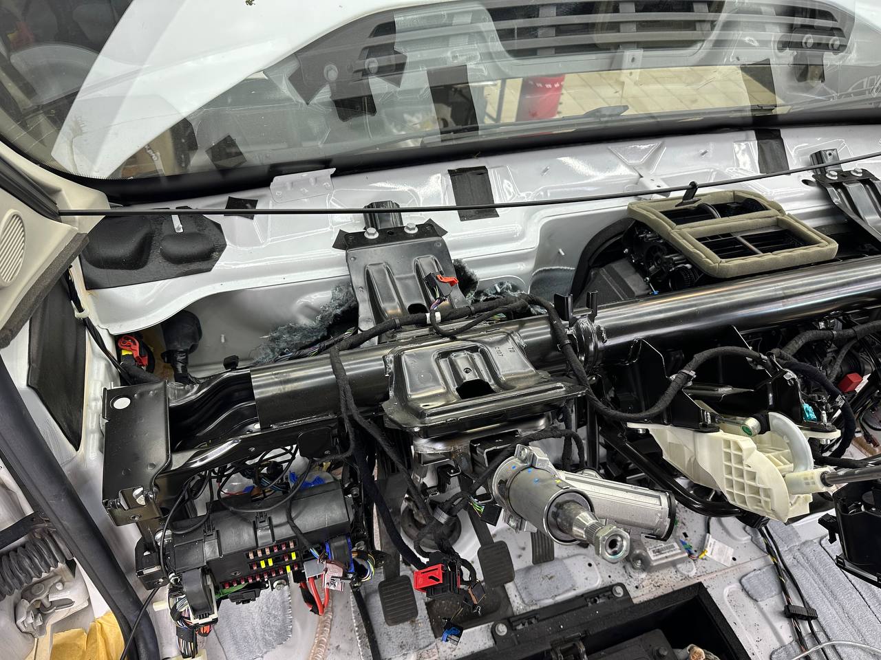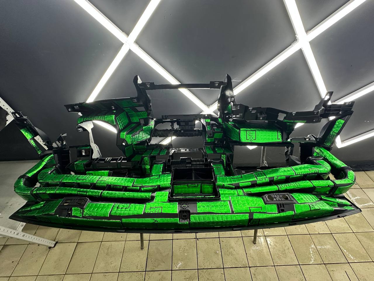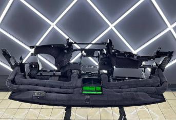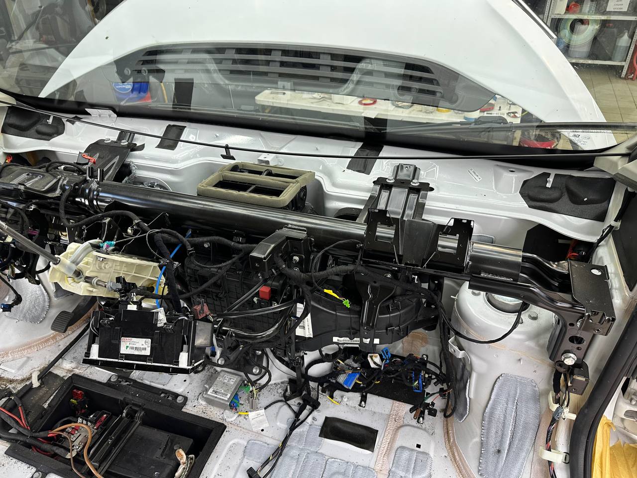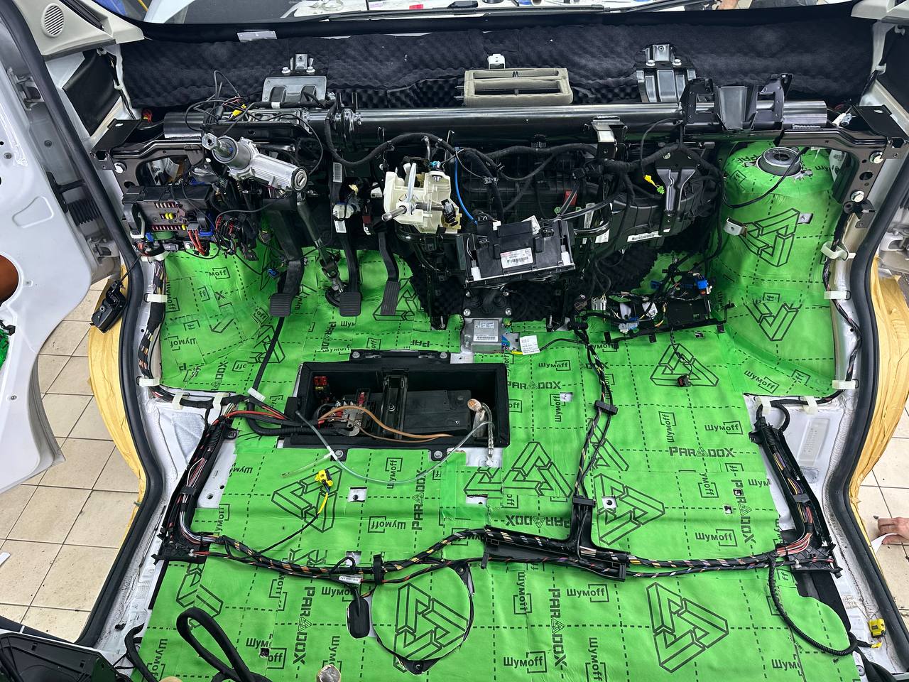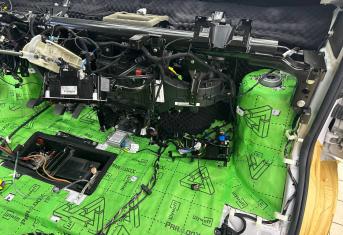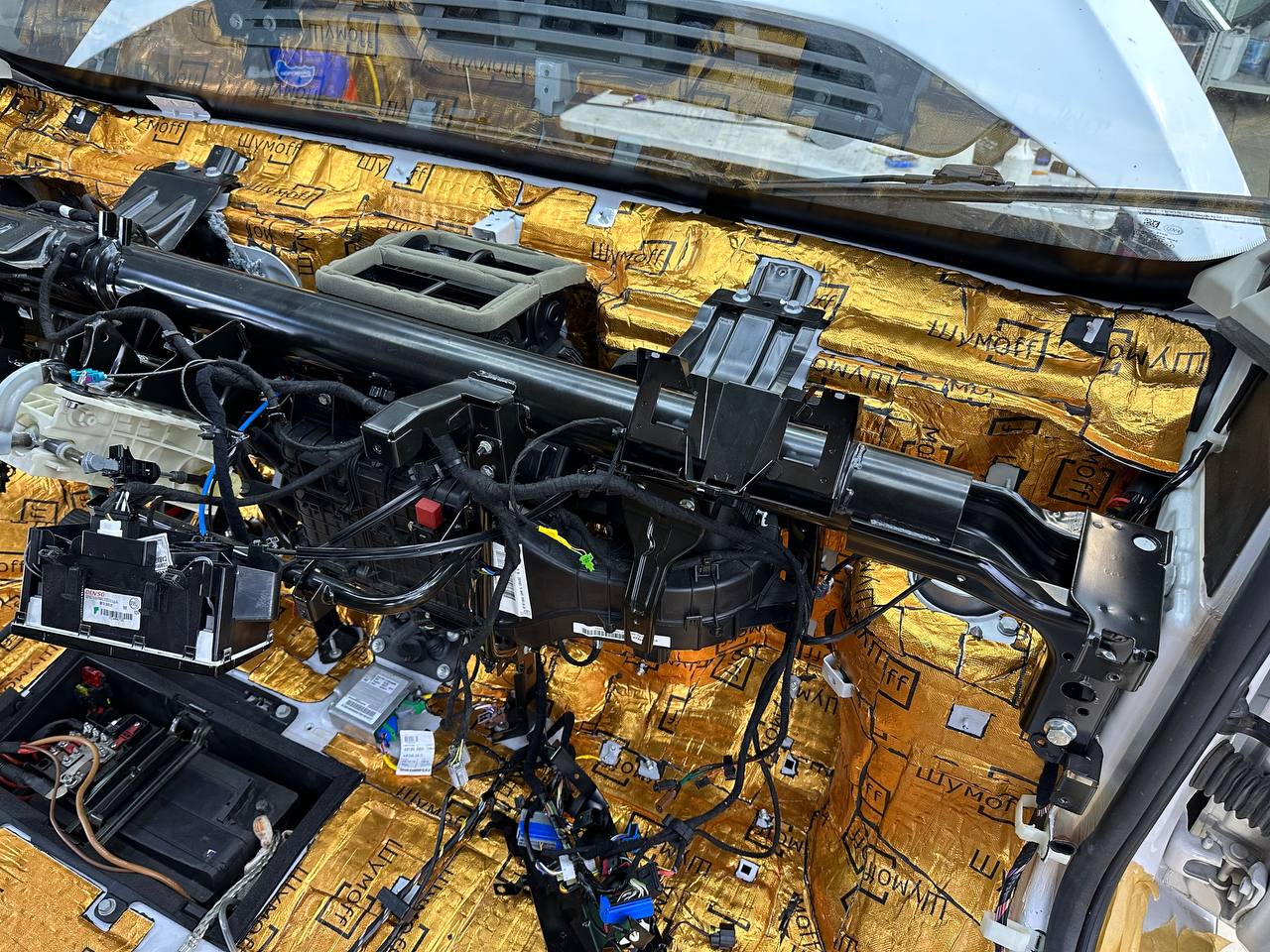 Приступаем к работам с полом и торпедой, на разборку всего салона уходит около 2-3 часов на данном авто включая торпеду. После чего мы подготавливаем поверхность, очистив ее от пыли и предварительно обезжирив. Штатная виброизоляция хорошо держится и её мы не демонтировали.