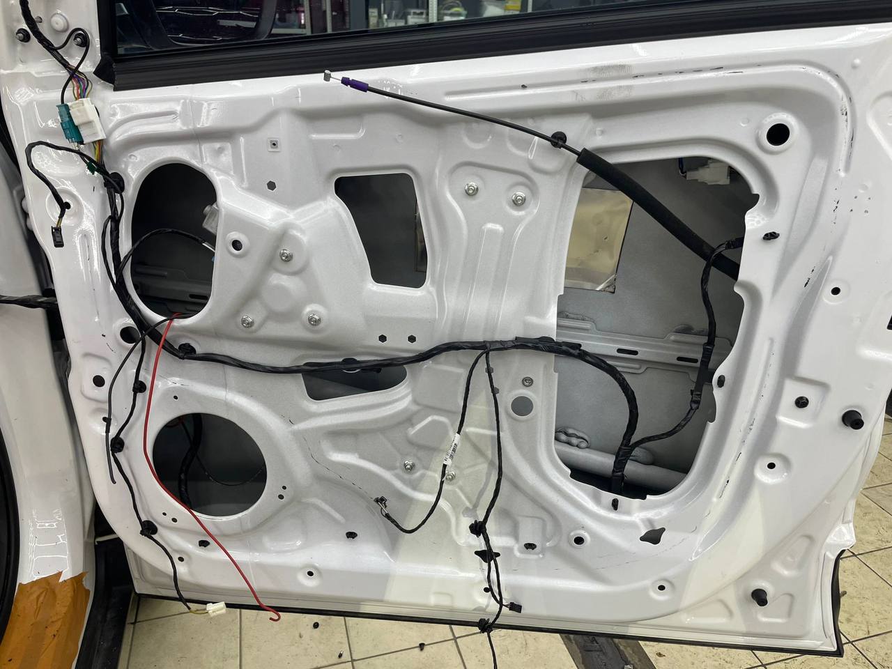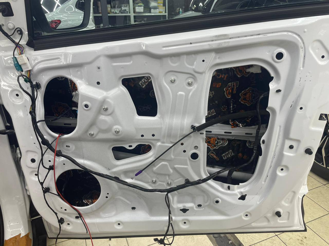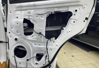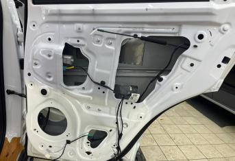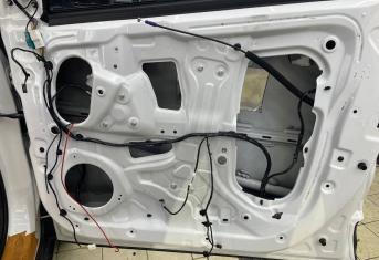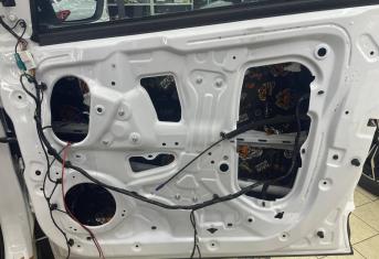 Начинаем работу с разборки дверей, подготовки поверхности и обезжириванию. Все работы по демонтажу пластика выполняются специальным инструментом. Мы гарантируем целостность клипс, креплений и отсутствие различного рода царапин, задиров на обшивках.