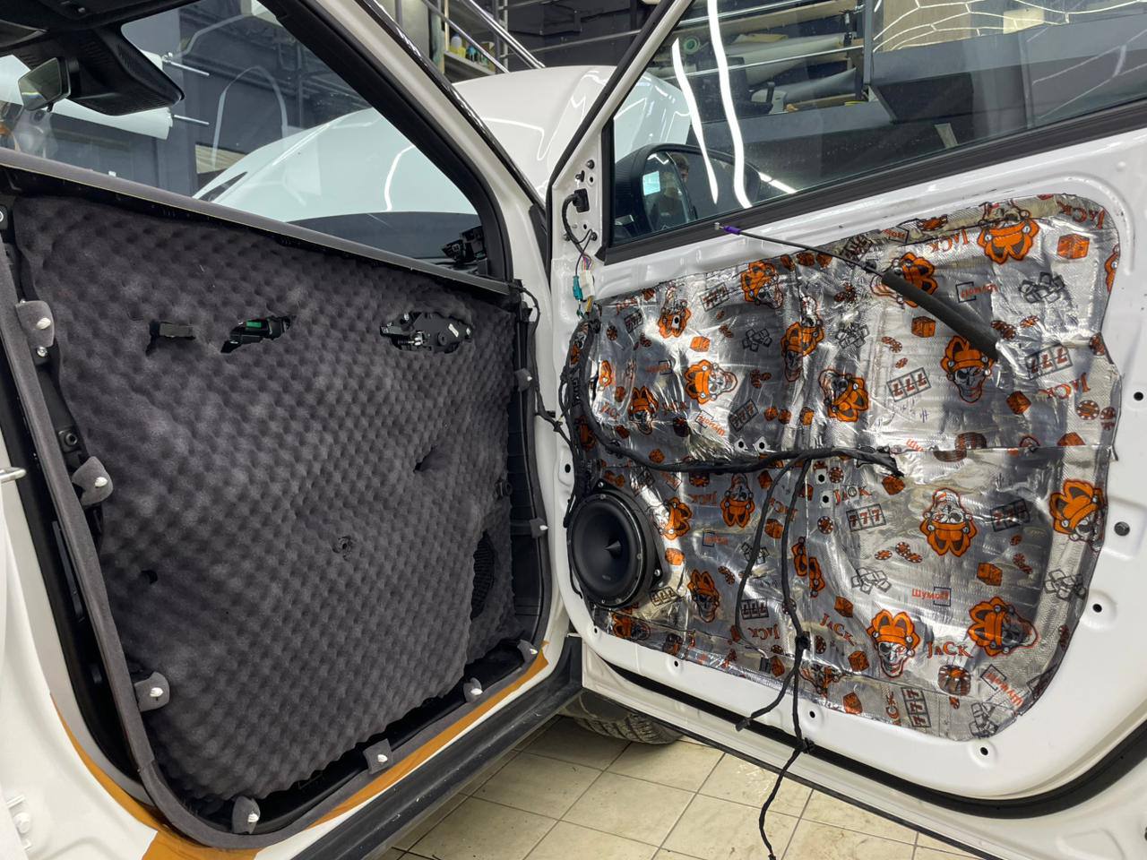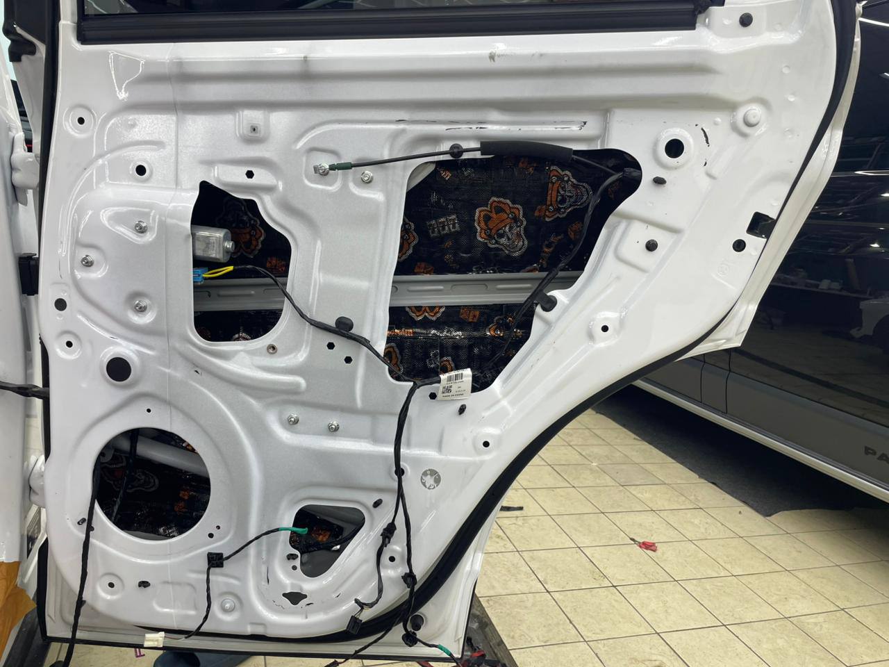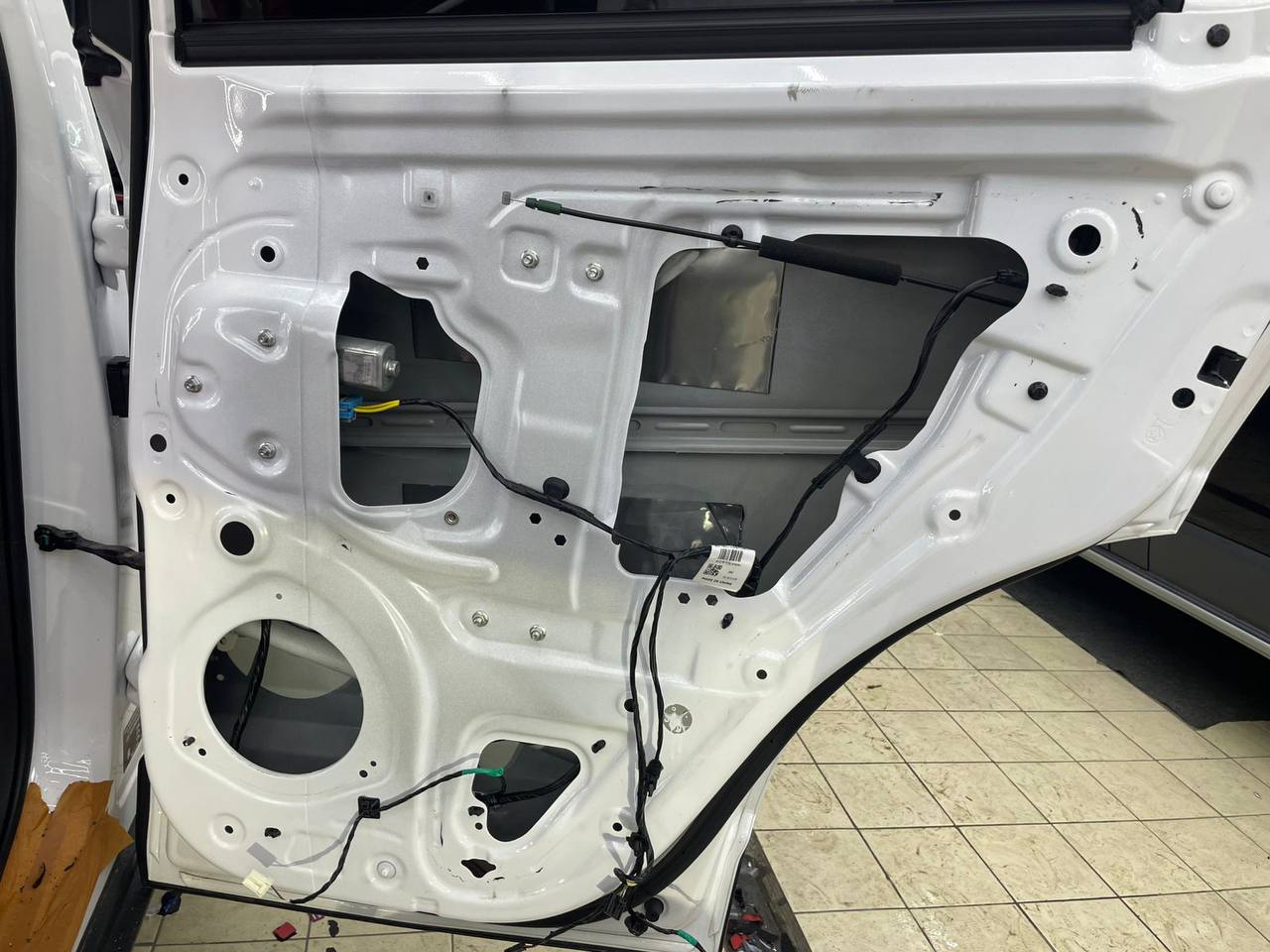 Начинаем работу с разборки дверей, подготовки поверхности и обезжириванию. Все работы по демонтажу пластика выполняются специальным инструментом. Мы гарантируем целостность клипс, креплений и отсутствие различного рода царапин, задиров на обшивках.