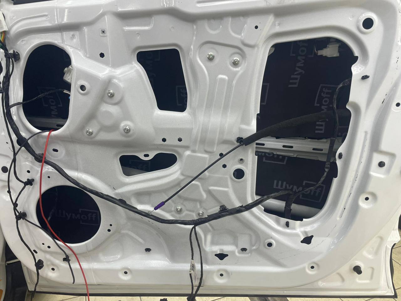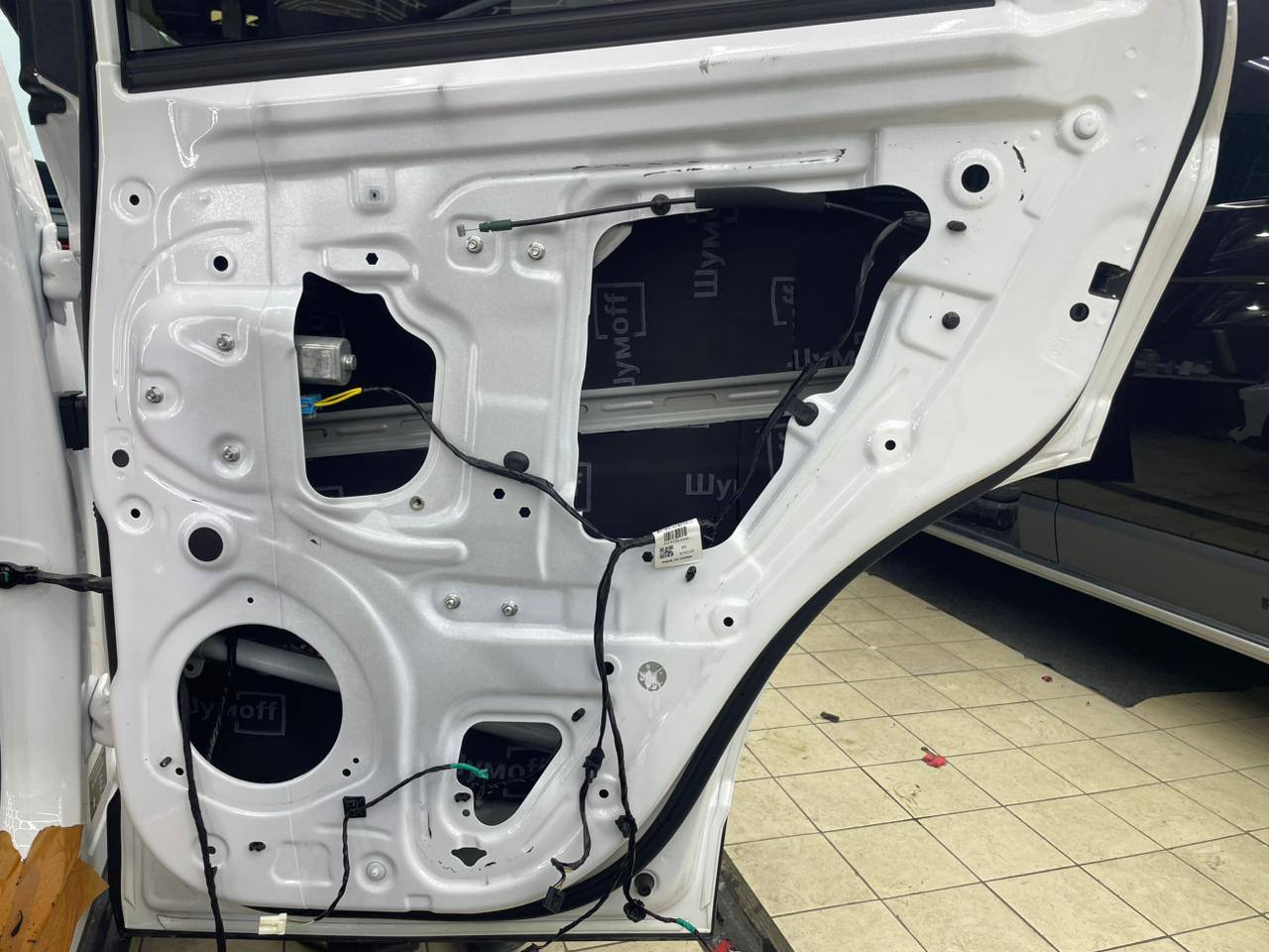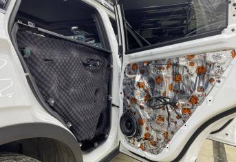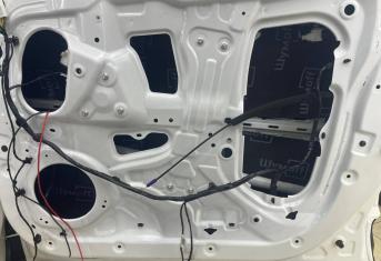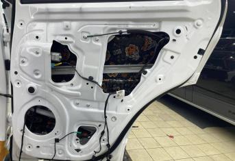 Третьим слоем применяем виброизоляцию Шумофф Jack на внутреннюю стенку двери. Проводку частично обрабатываем Шумофф Specific. Саму обшивку двери оклеиваем виброизоляцией Шумофф Jack и полностью закрываем шумопоглощающим материалом Шумофф Герметон А15. Обратите внимание, как тщательно мы обрабатываем двери виброизоляцией и шумопоглотителем - мы не экономим материал и щедро укладываем его в необходимые места. По канту обшивки двери и клипсы укладываем Шумофф Absorber 5, чтобы избежать раздражительных звуков и не портить ЛКП.