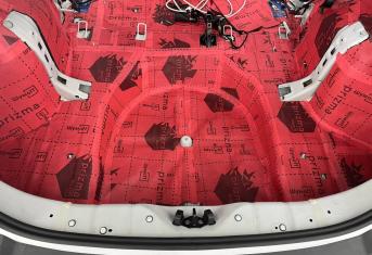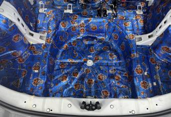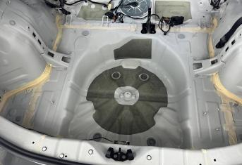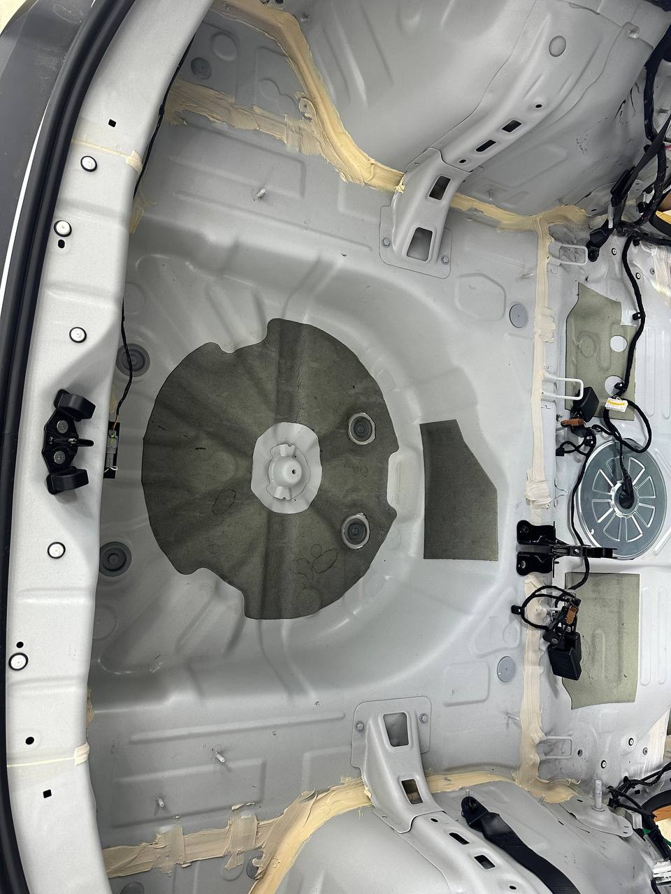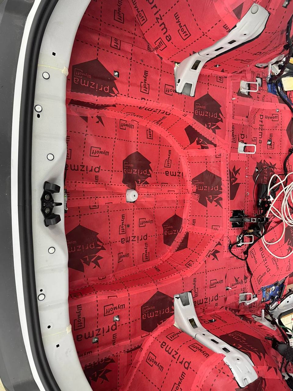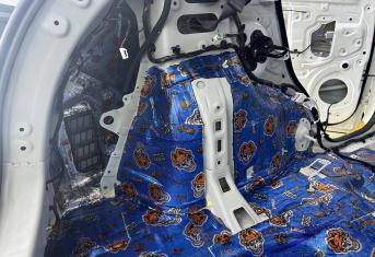 Штатная шумоизоляция в Geely Coolray уложена выборочно. Напыления вибродемпфера есть на полу салона и багажника, на задних арках и дверях. Ниже вы можете увидеть фотографии после полного разбора. Перед началом работ, мы в обязательном порядке проверяем заводскую шумоизоляцию на качество укладки. Плохо проклеенные участки демонтируем. После обезжириваем все поверхности и приступаем к монтажу.