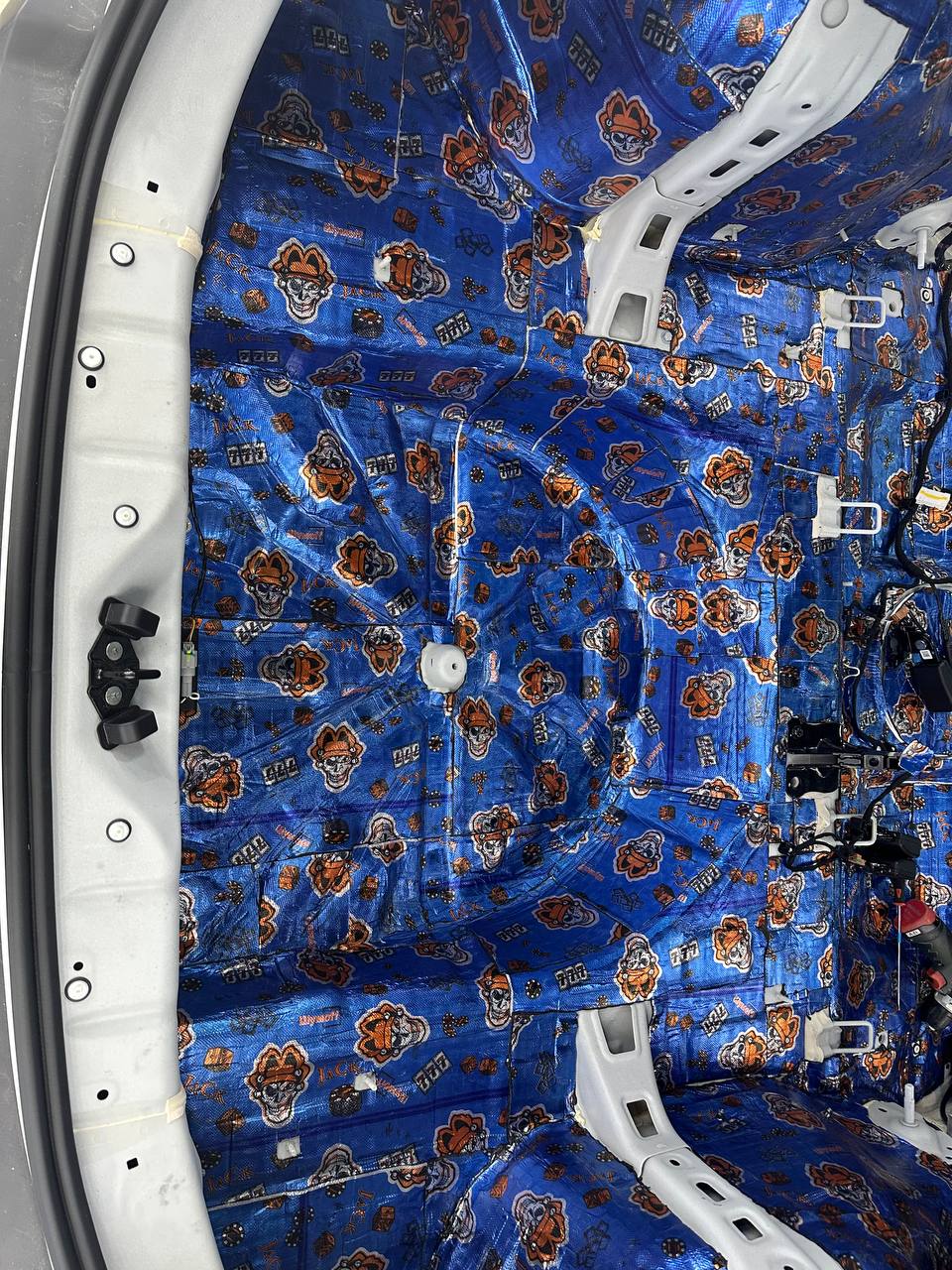 На внешний металл крышки капота наносим виброизоляцию ШумоФФ Jack, на штатную обивку капота монтируем шумотеплоизолятор Шумофф П4. Капот мы клеем бесплатно при заказе комплексной шумоизоляции автомобиля!