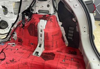 На внешний металл крышки багажника наносим виброизоляцию ШумоФФ Jack. На обшивку монтируем ШумоФФ Jack и шумопоглотитель Absorber A15. По канту обшивки и клипсы обрабатываем Шумофф Absorber 5. Проводку обрабатываем Шумофф Specific.