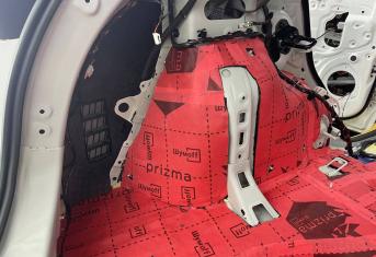 Второй слой – Шумофф Prizma шумоизолятор на основе вспененного каучука со звукоотражающей мембраной, это современный и технологичный материал который включает в себя сразу два слоя! Его мы применяем на всю плоскость пола салона и багажника в том числе и задние арки в багажнике. В задние крылья вторым слоем монтируем шумопоглотитель Шумофф Absorber А15, максимально закрывая всю плоскость крыла на сколько это позволяет конструкция автомобиля.
