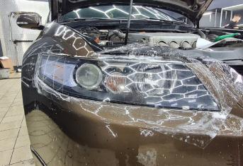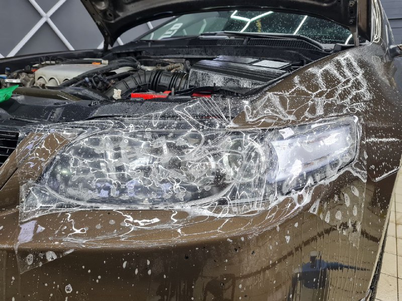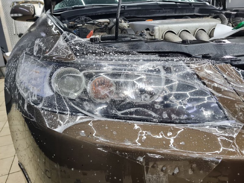 - Далее необходимо защитить фары. При абразивной полировке мы сняли часть лака с фар, стекла стали подвержены к помутнению. Применяем полиуретановую пленку NAR PPF с гидрофобным эффектом, толщиной 190 микрон, и керамическим слоем.