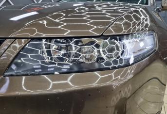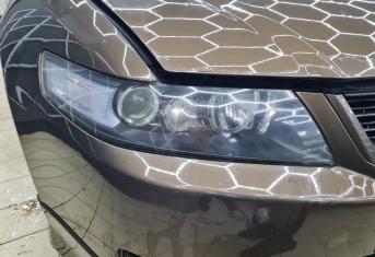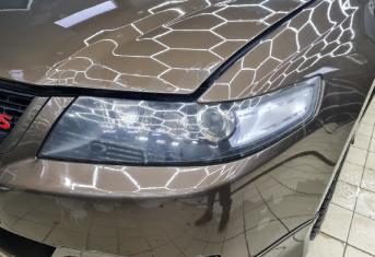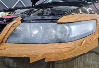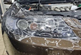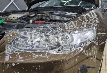 При увеличении пробега автомобиля наблюдается потеря прозрачности стекол, что влечёт за собой уменьшение светопропускания и может стать риском для безопасности на дороге. Honda Accord был доставлен для выполнения работ по восстановлению прозрачности фар и их последующей защиты полиуретановой пленкой.