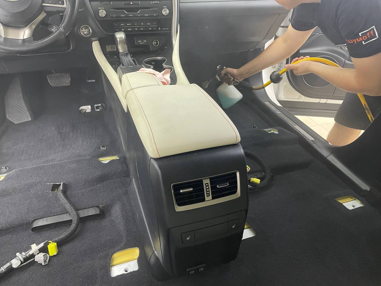 Мы потратили 1 рабочий день на обслуживание Lexus RX 300, что включало детейлинг химчистку салона с частичным разбором.