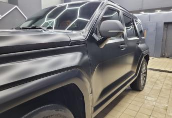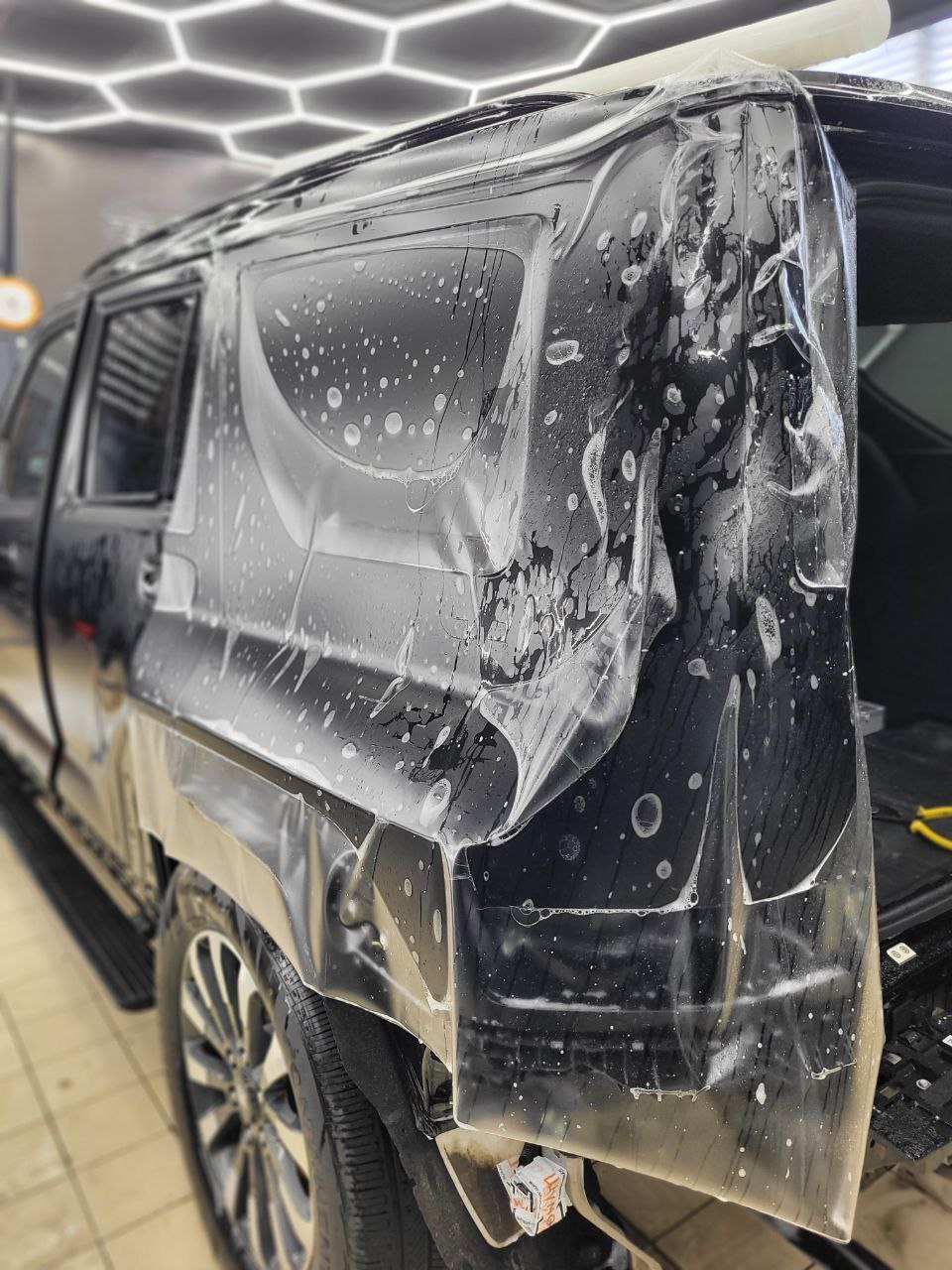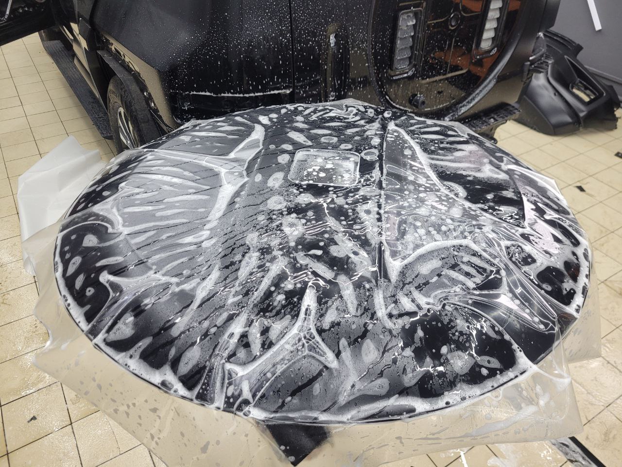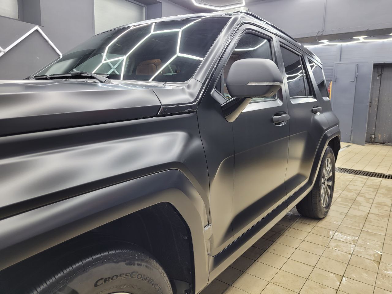 Далее не о процессе, а о конечном результате который получается на данном авто. Автомобиль будет меньше пачкаться, пленка обладает высоким гидрофобным эффектом и грязь не будет задерживаться на кузове. Ну и самое главное это защита, каждый оклеенный элемент выполнен с подворотом пленки по периметру. Сколы и царапины больше не угрожают ЛКП данного автомобиля, и если вдруг произойдет неприятная ситуация с мелким ДТП к примеру во дворе, с большей долей вероятности этот вопрос решиться заменой пленки на отдельном элементе. Сатин подчеркнул брутальность линий кузова и внедорожник несомненно будет выделяться в потоке.