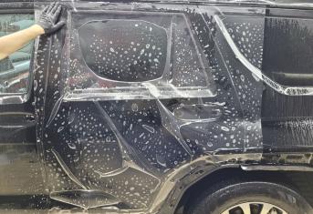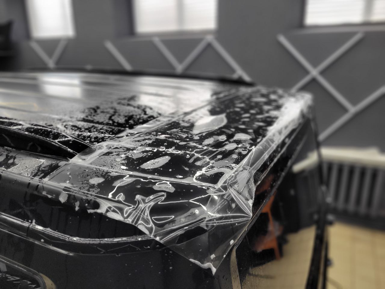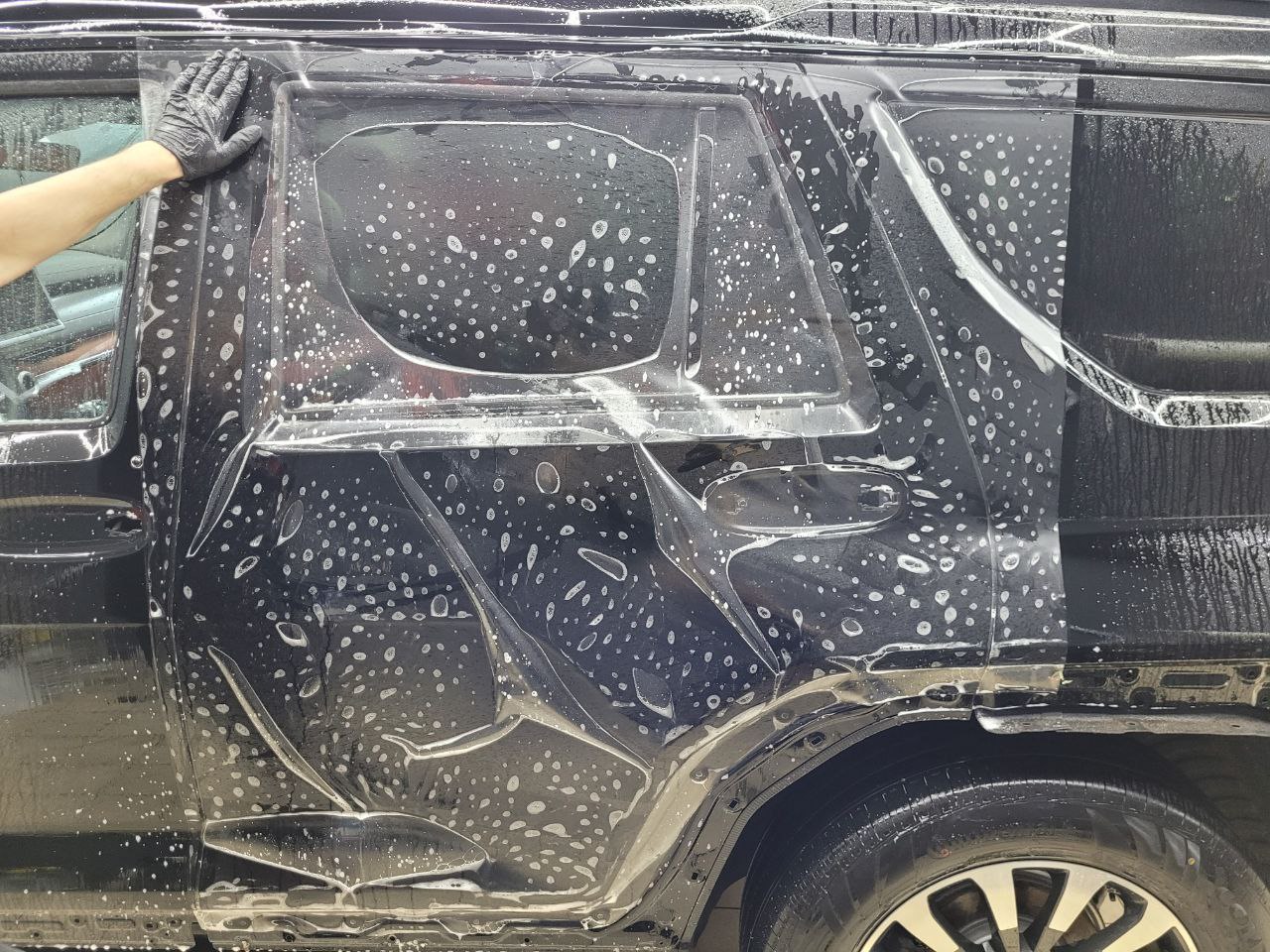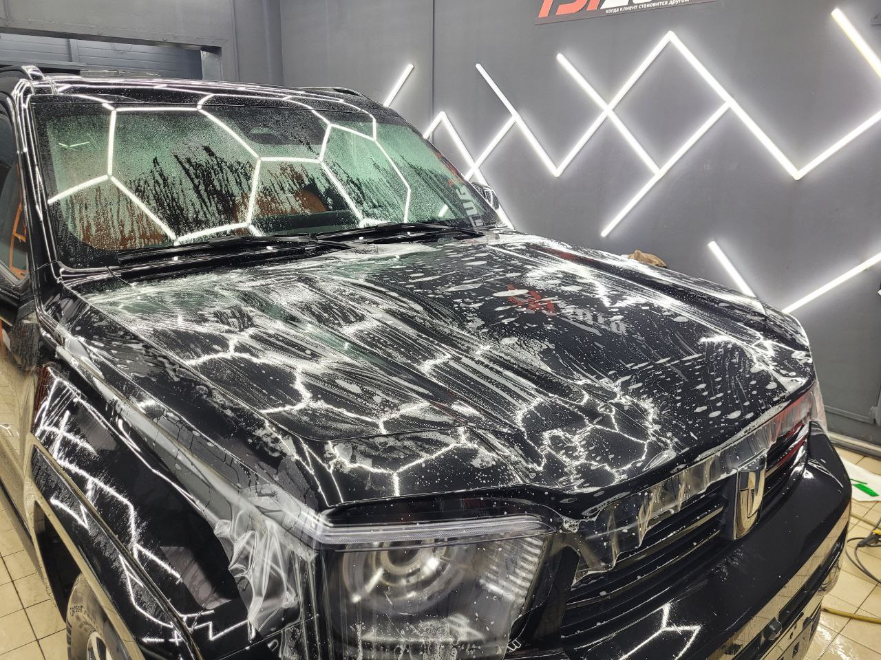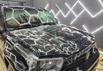 Далее не о процессе, а о конечном результате который получается на данном авто. Автомобиль будет меньше пачкаться, пленка обладает высоким гидрофобным эффектом и грязь не будет задерживаться на кузове. Ну и самое главное это защита, каждый оклеенный элемент выполнен с подворотом пленки по периметру. Сколы и царапины больше не угрожают ЛКП данного автомобиля, и если вдруг произойдет неприятная ситуация с мелким ДТП к примеру во дворе, с большей долей вероятности этот вопрос решиться заменой пленки на отдельном элементе. Сатин подчеркнул брутальность линий кузова и внедорожник несомненно будет выделяться в потоке.