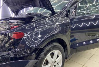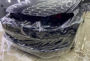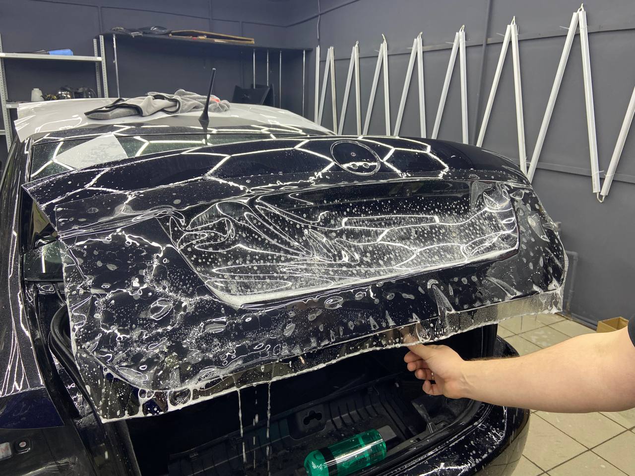 Далее не о процессе, а о конечном результате который получается на данном авто. Автомобиль будет меньше пачкаться, пленка обладает высоким гидрофобным эффектом и грязь не будет задерживаться на кузове. Ну и самое главное это защита, кузов защищен полностью! Каждый оклеенный элемент выполнен с подворотом пленки по периметру. Сколы и царапины больше не угрожают кузовным элементам данного автомобиля, и если вдруг произойдет неприятная ситуация с мелким ДТП к примеру во дворе, с большей долей вероятности этот вопрос решиться заменой пленки на отдельном элементе. Так же автомобиль обрел на долго гарантированный блеск, так как пленка имеет самозаживляющий эффект и мелкие риски и царапинки будут затягиваться под воздействием температуры.