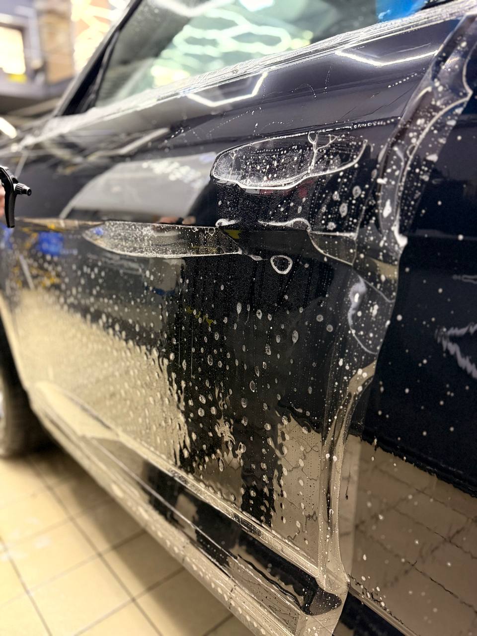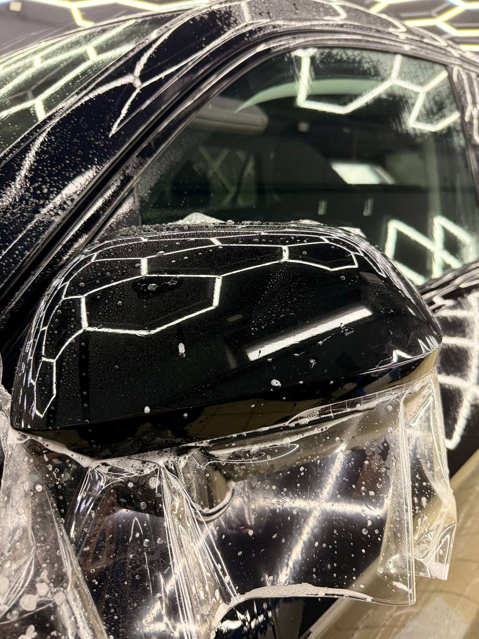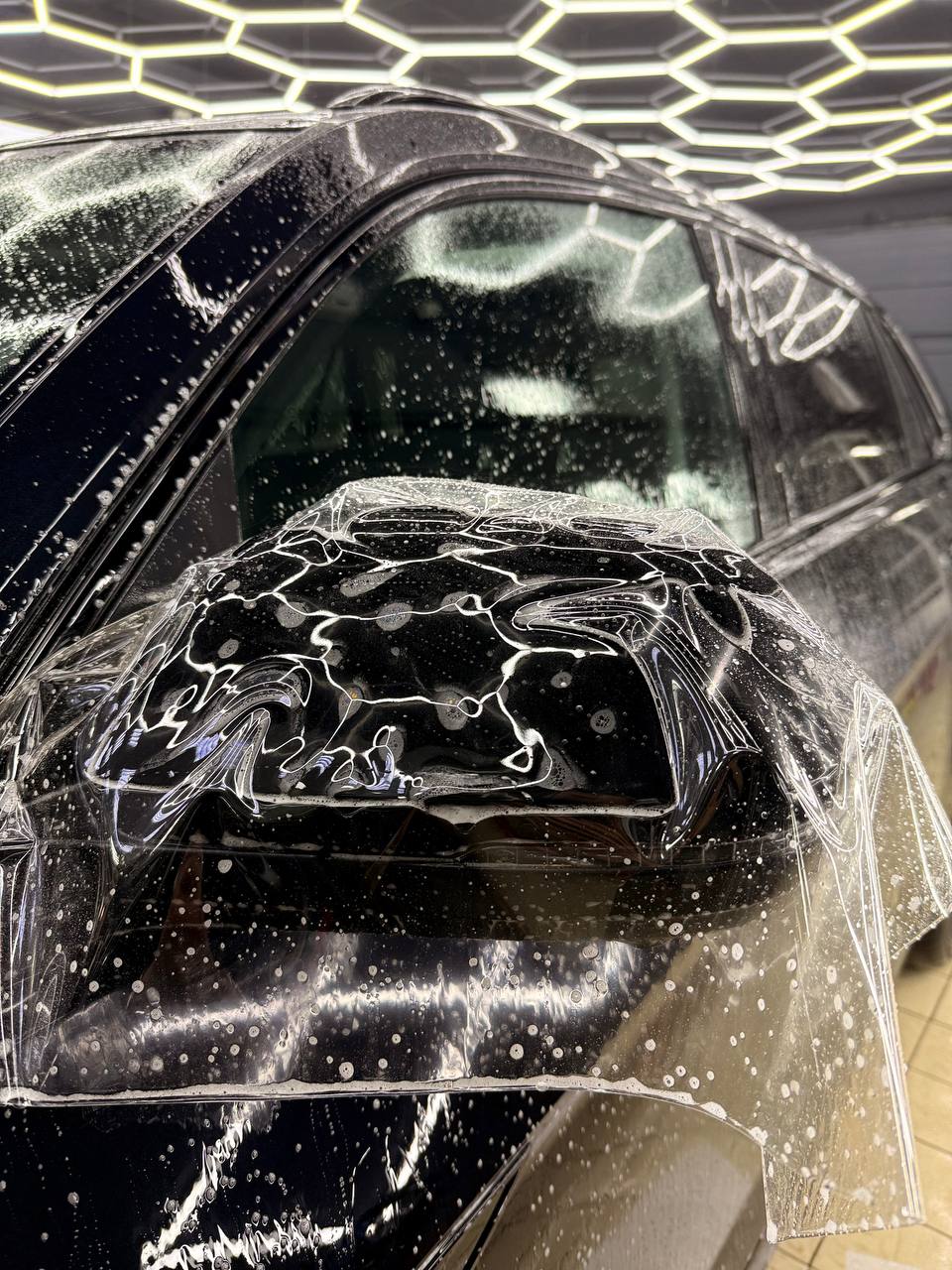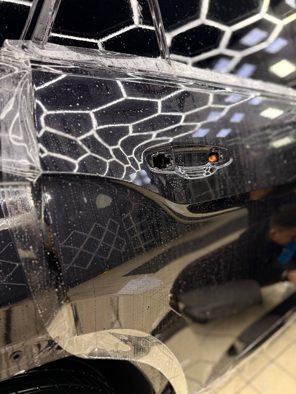 Далее не о процессе, а о конечном результате который получается на данном авто. Автомобиль будет меньше пачкаться, пленка обладает высоким гидрофобным эффектом и грязь не будет задерживаться на кузове. Ну и самое главное это защита, каждый оклеенный элемент выполнен с подворотом пленки по периметру. Сколы и царапины больше не угрожают ЛКП данного автомобиля, и если вдруг произойдет неприятная ситуация с мелким ДТП к примеру во дворе, с большей долей вероятности этот вопрос решиться заменой пленки на отдельном элементе. Так же автомобиль обрел на долго гарантированный блеск, так как пленка имеет самозаживляющий эффект и мелкие риски и царапинки будут затягиваться под воздействием температуры.
